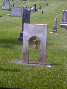 There is no inscription from this side, but there are a couple of possibilities that I can surmise for now. It could be some sort of ring this bell for my angel” type thing OR it could be from the Victorian Era when people were afraid of being buried alive. Urban myth says that there was a rash of that occurring. Anyway, they rigged the bell to the inside of the casket. In case you woke up buried alive, you pulled the cord and the bell rang as a sign of “I’m not dead yet!” Ew.