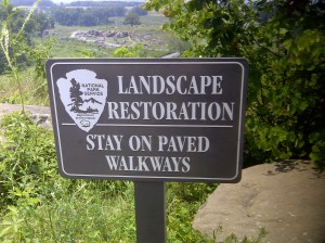 This photo was taken from Little Round Top, looking down into Devil’s Den. I love the sign! All over the Park, they are planting vegetation that was there at the time of the battle. There will be peach trees in the Peach Orchard, wheat in the Wheatfield, and native plants in the uncultivated areas. That’s a terrific idea!