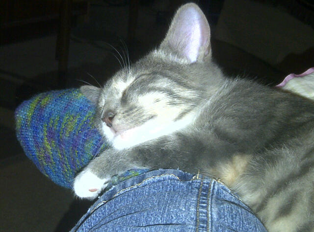 In preparation for their arrival, I went to Wal-Mart and Petco for supplies. Of course, I had to buy toys. Wal-Mart had a packet of fuzzy, fake mice in neon colors. Pyewacket loves to wait until the lights are off to snag a mouse from the toy box and bring it to bed. Then he plays. He’ll toss the mouse, dive on it and wrestle it, preferably while trapping the mouse against my thigh with his front paws and kicking it with his back. Another toss and dive onto my stomach is usually next; followed by digging the mouse out from under me, whether that’s where it has landed or not. By which time I yell, “No mice in the bed!”
